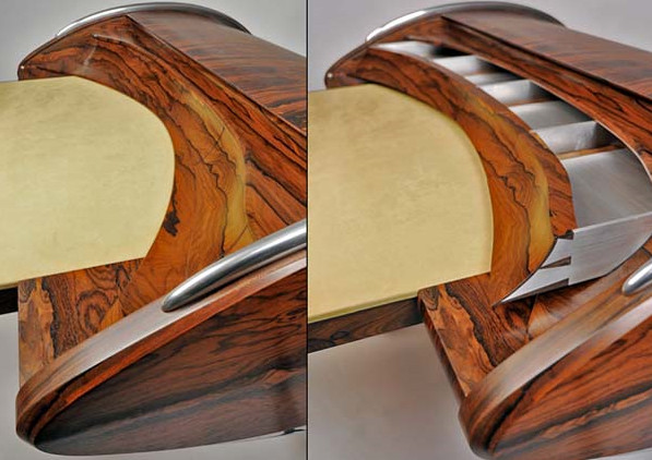 This desk was made for a clutter free environment. The minimalist design doesn`t allow interference with any kind of disorganized space. A storage space built into the surface of the desk allows for peripherals and cables to be hidden. Mahogany wood and faux leather were used to build it and a beautiful design makes the StudioDesk a desirable piece of furniture.